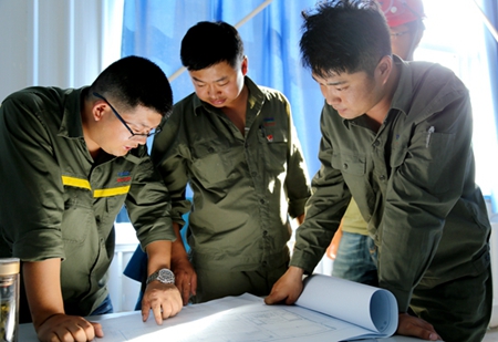 午后的检维修车间在烈日下变成了一个大烤箱,室内高达34度的高温仿佛也带动了建设者们的“热情”,堆满图纸、文件的办公桌看似凌乱,但大家都保持着有条不紊、孜孜不倦的状态去全身心的投入到工作中。