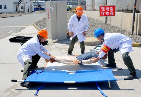 本次急演练共由九部分组成,是模拟公司成品罐区甲醇储罐09v0903A进料管线由于地震原因导致金属软管破裂,甲醇大量泄漏,罐壁阀门内漏,人员误入中毒,在人员救出后,因不明原因起火,直接威胁整个储罐区,影响整个工厂安全。公司储运部按照预案迅速自救,并向公司生产调度中心汇报情况,生产调度中心立刻启动公司级应急预案,随后拨打电话向公司领导进行汇报情况,各应急小组立即赶到事故现场展开救援,从紧张的汇报、场景的不断变化及现场指挥权的逐级移交将现场的紧张气氛不断升级。在短短的十几分钟,人员在紧急情况下,正确的判断紧急应变能力、做到正压空气呼吸器的穿戴、心肺复苏的急救及消防救援器材的使用等,演练从实战出发,现场紧张有序、有条不紊,岗位员工行动迅速,操作规范,最终在奇台县政府各单位的全力配合下,圆满完成此次应急救援演练任务。