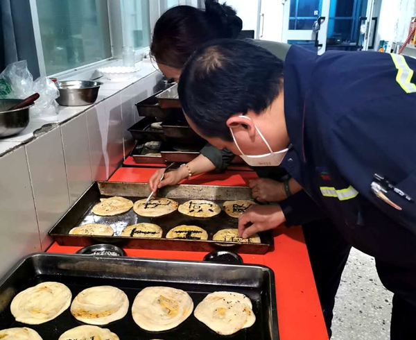 在综合管理部、储运部、安管部女职工的共同配合下,摘菜、洗菜、切菜、和面、包馅、烤制、售卖一系列程序,从手忙脚乱到井然有序,没有下厨经验的“学徒”开始,到“师傅”的帮助下大家越做越好,大家在宵夜结束后还在探讨着明日的“新品种”。已经持续了半个月的宵夜供应,在有限的条件下,从麻辣香饼、茶叶蛋到卤鸡腿、青椒火腿馅饼,已经变换花样的为员工提供了九种品类。在一天高负荷的工作之后,还要每天制作七八十份的宵夜,不是一件容易的事情,但他们并没有因为困难而放弃,也没有因为忙碌而终止,互相调侃厨艺成为了他们寻找快乐的特殊方式,制作的美食获得大家的认可成为了他们获得满足的途径。既要奉献,就要成为一名快乐的“志愿者”。