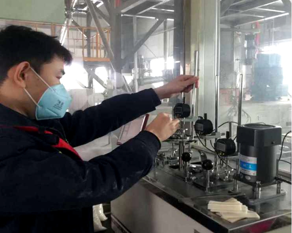 (2)聚酯公司PBS装置模切机机房内,一名老职工带着一名新职工正在给他讲解设备知识和注意事项。
