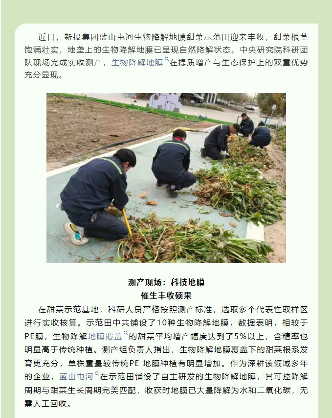 • 近日,新投集团太阳集团官网生物降解地膜甜菜示范田迎来丰收,甜菜根茎饱满壮实,地垄上的生物降解地膜已呈现自然降解状态。中央研究院科研团队现场完成实收测产,生物降解地膜在提质增产与生态保护上的双重优势充分显现