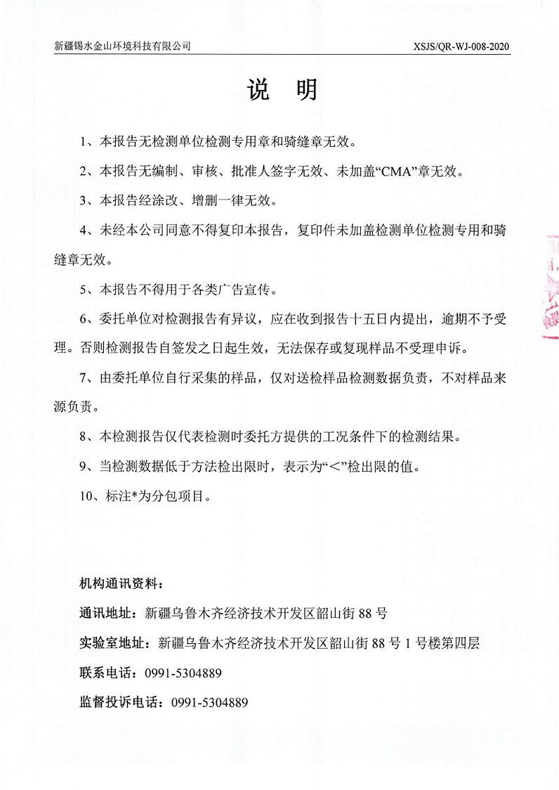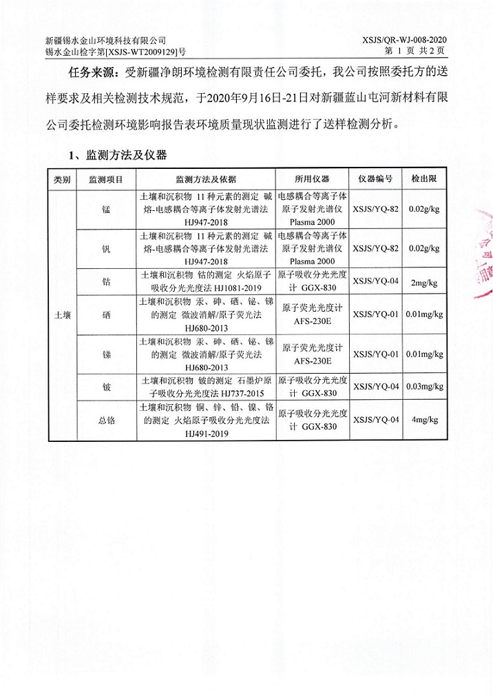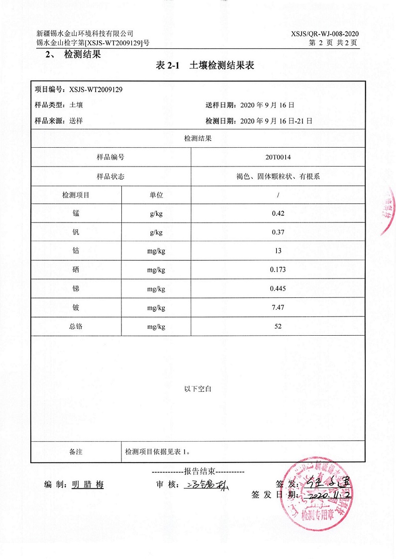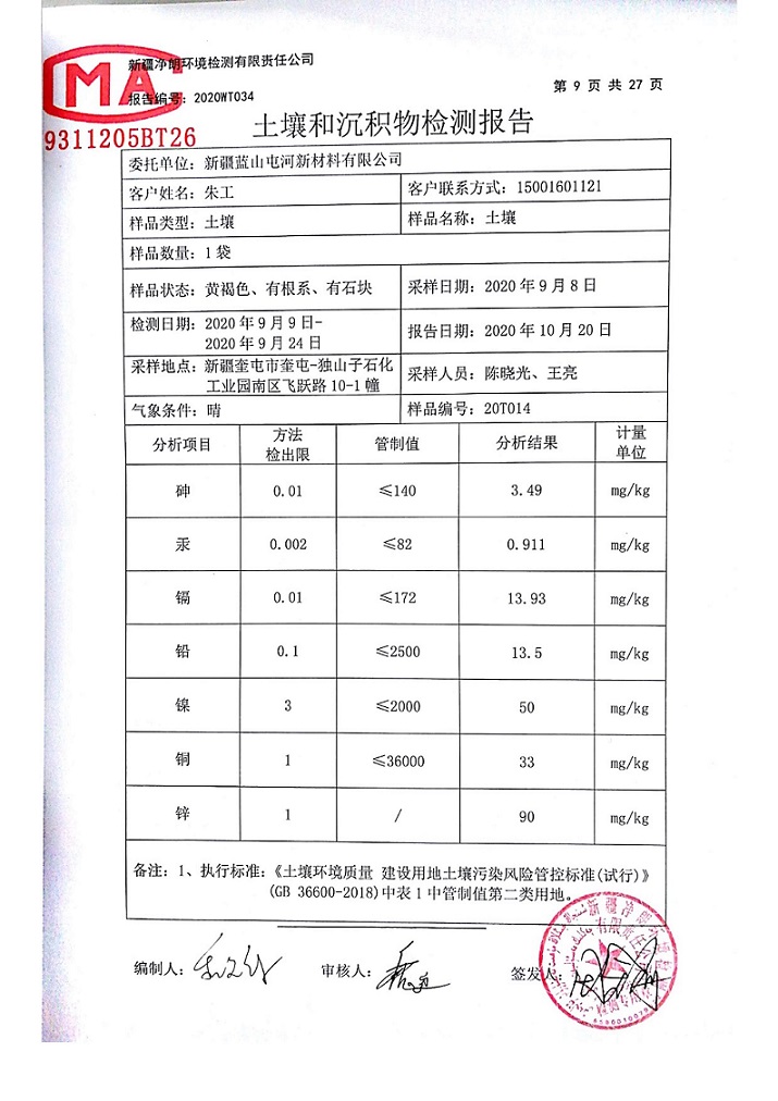2020年9月8日,新疆净朗环境检测有限责任公司、新疆锡水金山环境科技有限公司在新材料公司内抽取土壤样本,进行检测,根据奎屯-独山子经济技术开发区环保局要求,现将新疆太阳集团官网新材料有限公司2020年重点污染单位土壤检测情况公示如下: